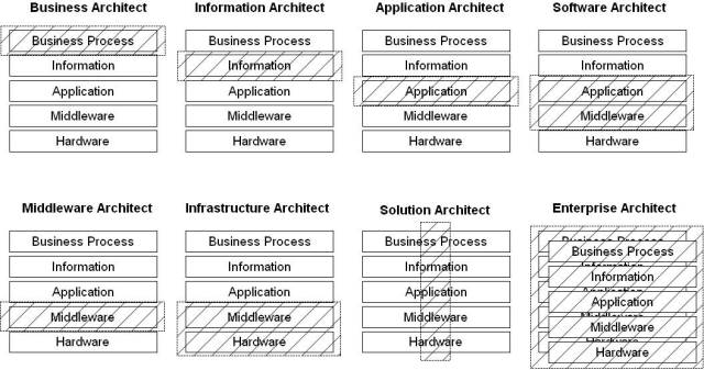 The IT industry tends to bandy around a number of different architect roles. Working with different clients, as I do, I find there is often confusion about what all these roles do. I find the following diagram helps to explain the different roles that IT architects take. Of course the important point to emphasise is that these are roles not job titles. In other words, one person may take on multiple roles on any given project so this is not meant to be a a way of generating architecture jobs but is merely a way of showing the different skill areas or disciplines that need to be applied when building a solution that is comprised of multiple layers.