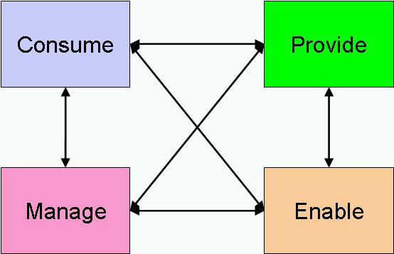 • Governance (manage) is integrated into everyday work. Example: negotiating the interface for a business service.