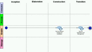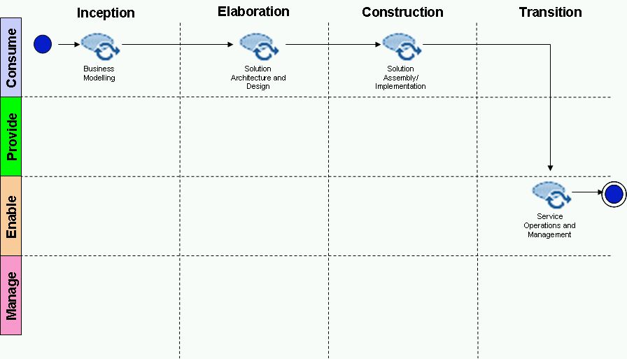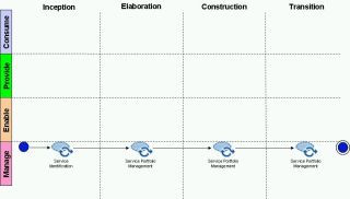 Activities produce one or more work products which are consumed by other activities, either in the same capability pattern, or in a different one. This means that provided the input and output work products are agreed the capability patterns can run in parallel or, if needed, at different times. So, one capability pattern, the ‘provide capability’ one in the above example can contribute to the Service Model work product which another capability pattern, the ‘manage service portfolio’ one can contribute to at a later time if need be. Having a common set of agreed work products, which are shared in a repository, becomes the key to having an effective delivery process.